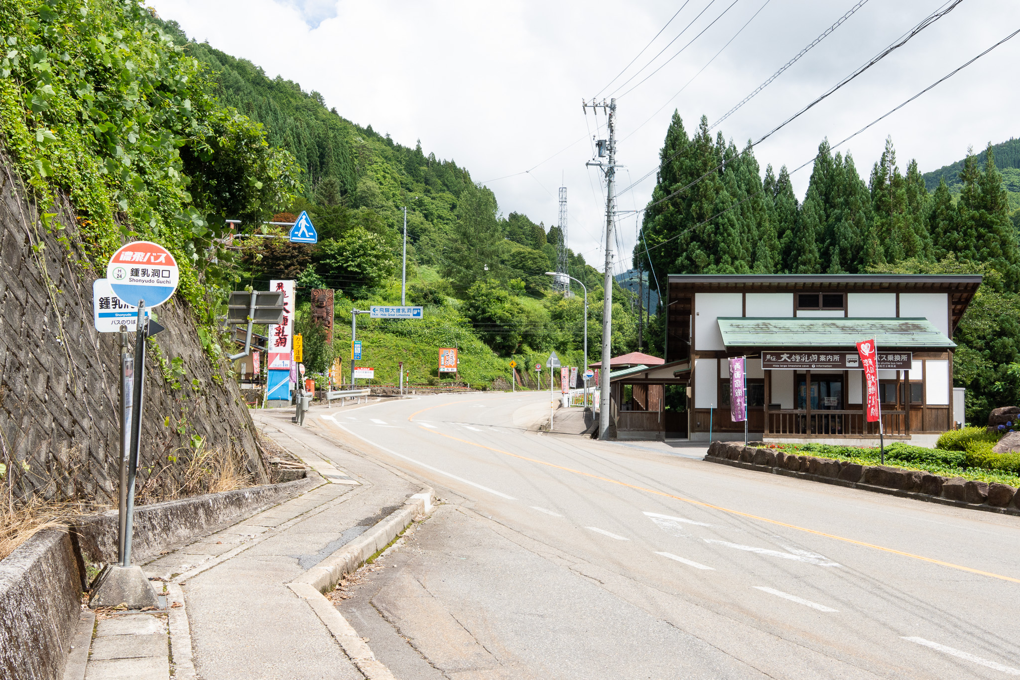 高山濃飛バスセンターから30分ほどで、鍾乳洞口バス停に到着します。