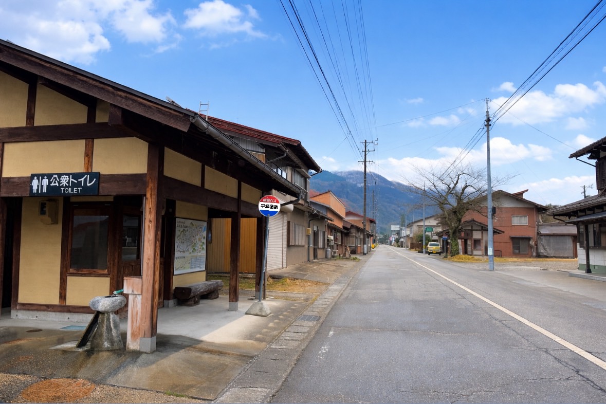 高山濃飛バスセンター====平瀬温泉バス停==(徒歩約10分)==<大白川温泉しらみずの湯で入浴&選べる昼食>==(徒歩約10分)==平瀬温泉バス停====白川郷・・・<世界遺産白川郷合掌集落を散策>====高山濃飛バスセンター