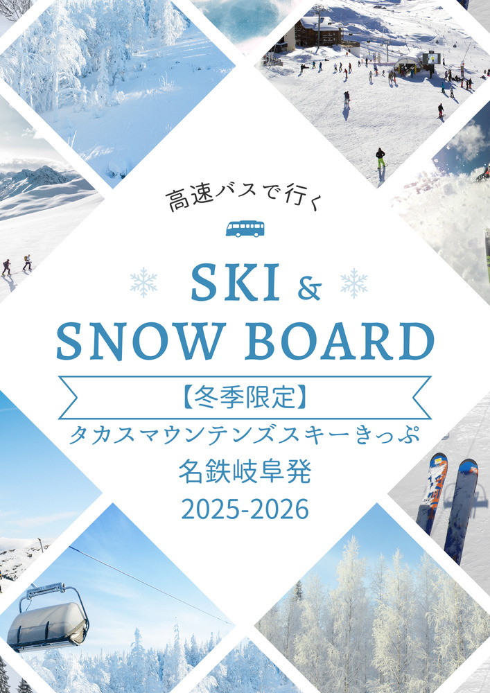 名鉄岐阜~ひるがの高原の高速バス往復乗車券と、タカスマウンテンズスキー場1日リフト券、スキー・スノーボード関連商品をお得にレンタルできる割引券がセットになった切符です。