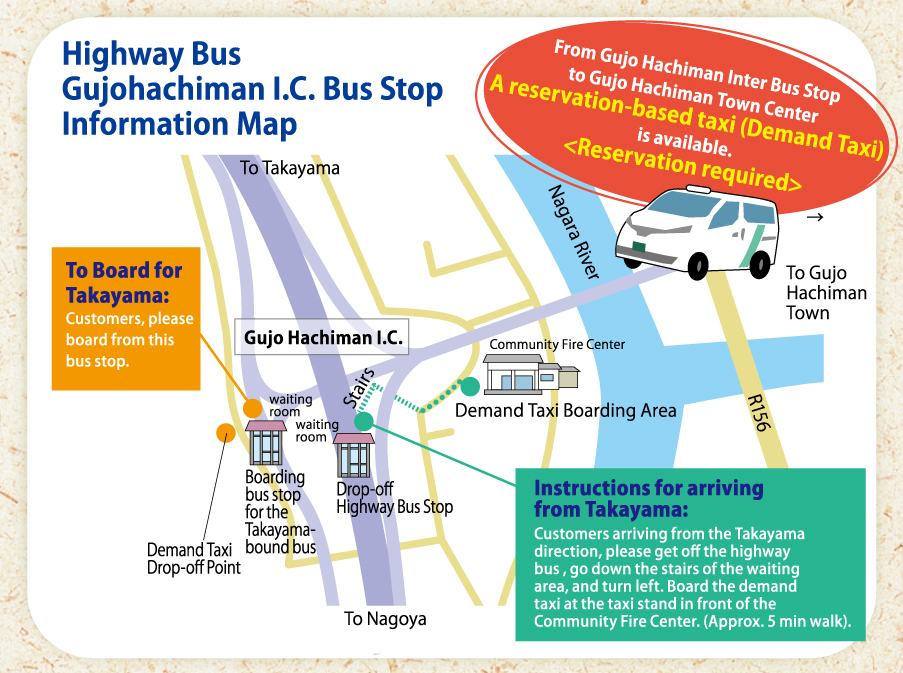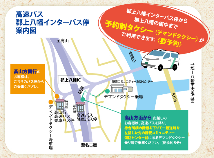 For travel from Gujo Hachiman I.C. Bus Stop to Gujo Hachiman city center, we recommend our reservation-only taxi service (demand-responsive transport).