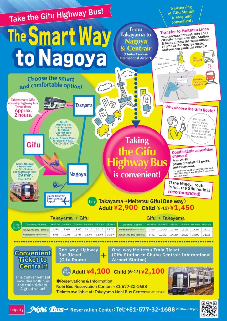 Please reserve at ticket office.(Takayama Nohi Bus Terminal, Meitetsu Bus Terminal, JR Tokai Bus Travel Center).