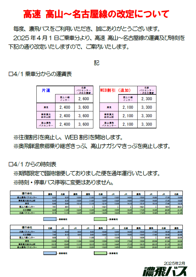 Language 日本語English Menu ホーム バス バストップ 高速バス・特急バス 路線バス・特急バス 貸切バス お得な乗車券 タクシー タクシートップ 車両のご案内 観光ルートタクシー シルバー・いきいきタクシーサービスのご案内 子育てタクシーのご案内 売店・飲食 旅行 旅行トップ トラベルセンター 濃飛グリーンツアー 飛騨を楽しむ 気ままなバス旅 お得な乗車券 採用案内 会社案内 会社情報 安全確保に関する取り組み 健康経営の取組み 運輸安全マネジメントの取り組み 環境保全活動に関する取り組み 女性活躍推進法に基づく一般事業主行動計画 個人情報保護方針 特定商取引法に基づく表記 お問い合せ ホーム> 濃飛バスからのお知らせ> 【2025年4月1日~】高速高山~名古屋線の改定について 【2025年4月1日~】高速高山~名古屋線の改定について 2025年2月18日 毎度、濃飛バスをご利用いただき、誠にありがとうございます。 2025年4月1日ご乗車分より、高速 高山~名古屋線の運賃及び時刻を下記の通り改定いたしますので、ご案内いたします。 一覧を見る