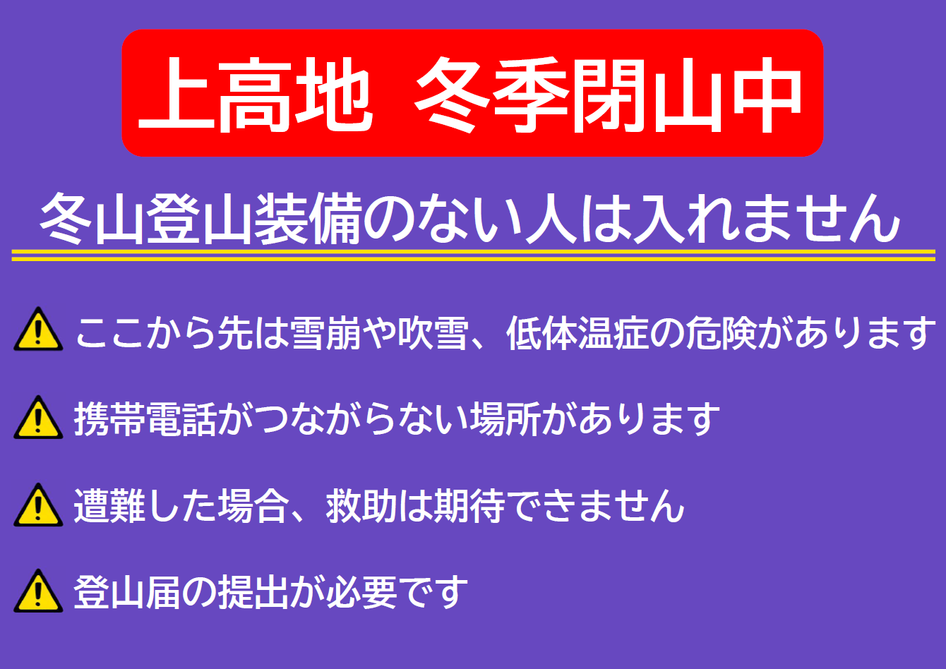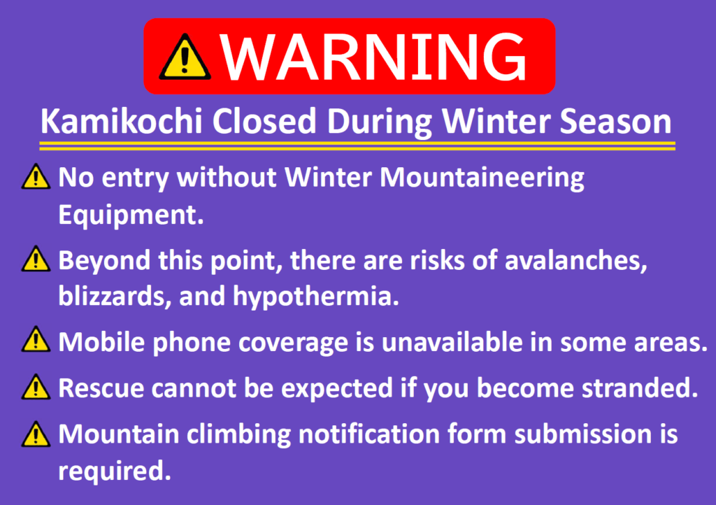 上高地の冬季閉山期間中は、冬山登山装備のない人は入れませんのでご注意ください。