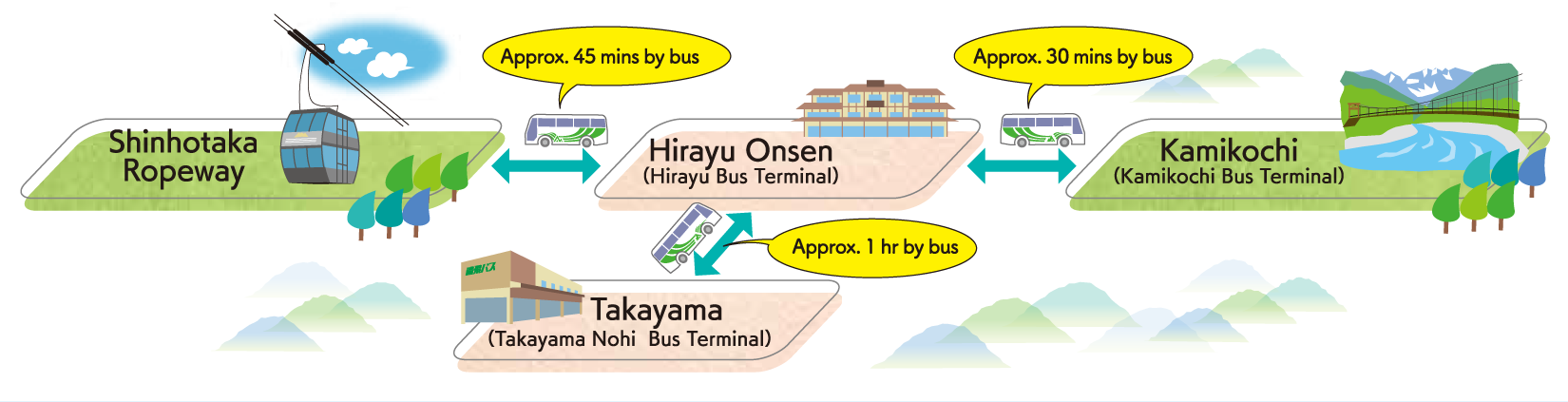 ■On the route between Takayama, Hirayu Onsen, and Shinhotaka Ropeway, only buses operated by Nohi Bus are available.