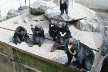 ツキノワグマやヒグマなど、150頭余りの熊が大集合。えさをおねだりするクマと楽しいひとときを。