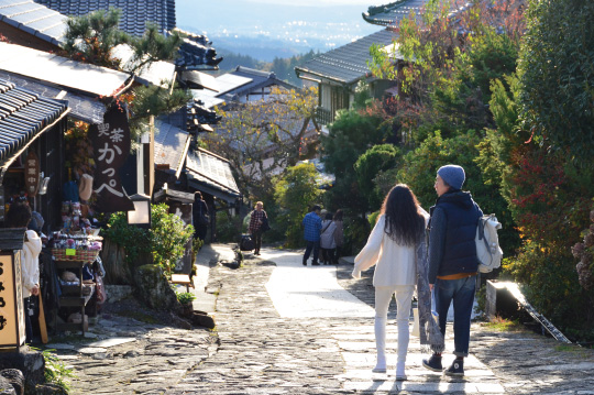 馬籠宿は江戸と京都を結ぶ街道、中山道の宿場町で、石畳の坂道に沿って建つ集落は江戸時代の面影を色濃く残しています。標高約600mと比較的高い場所に位置し、中津川の街並みや日本百名山の一つ、恵那山も一望できる景観の美しい観光スポットです。