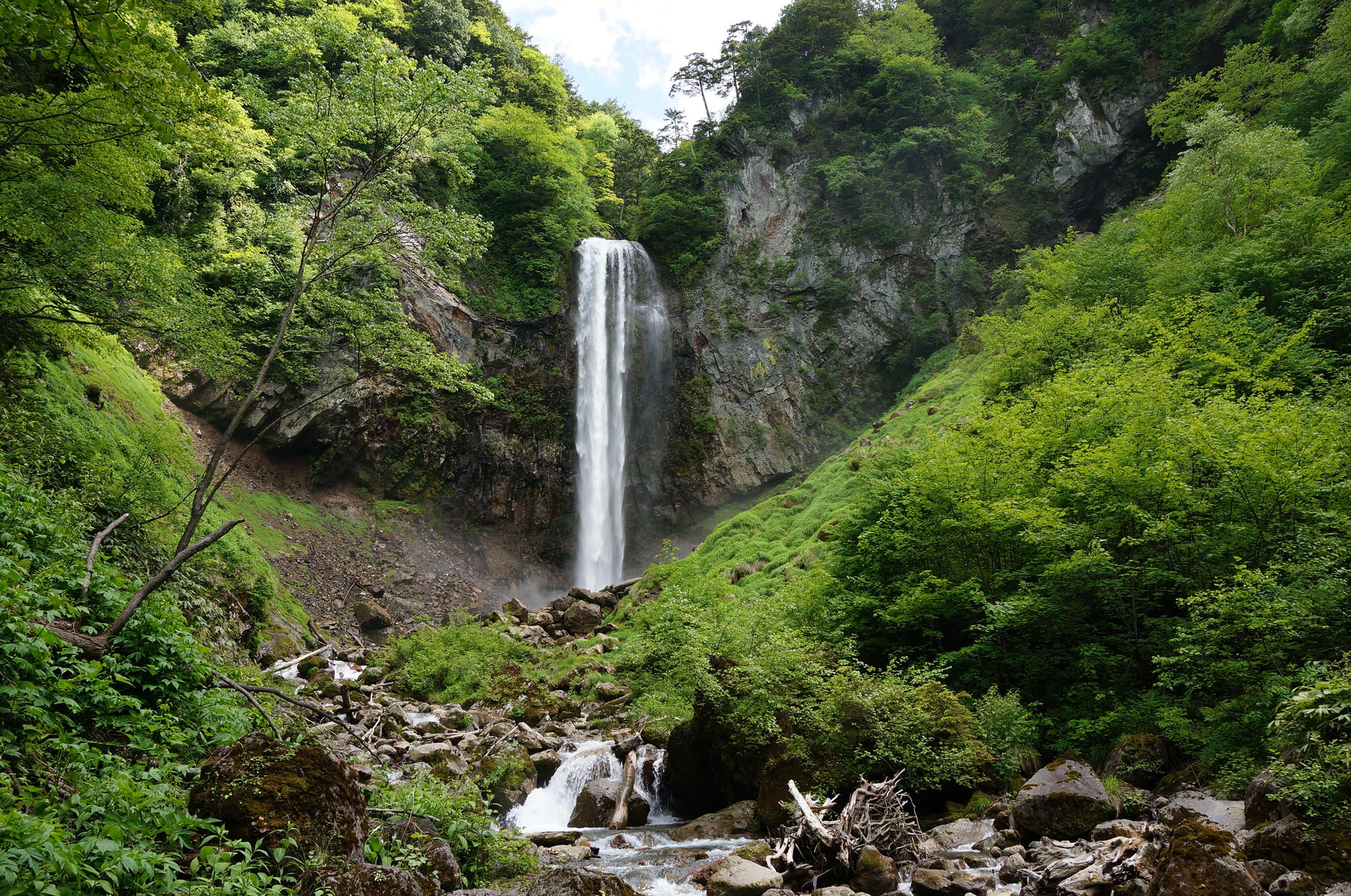 Hirayu Grand Waterfall is one of Hida's three major waterfalls in drop length and selected as one of "Japan's Top 100 Waterfalls." Its abundant water and roaring sound are magnificent; the surrounding area is shrouded by negative ions and mist. The rock surface covered by babbling clear water and the moss heals tourists' hearts.