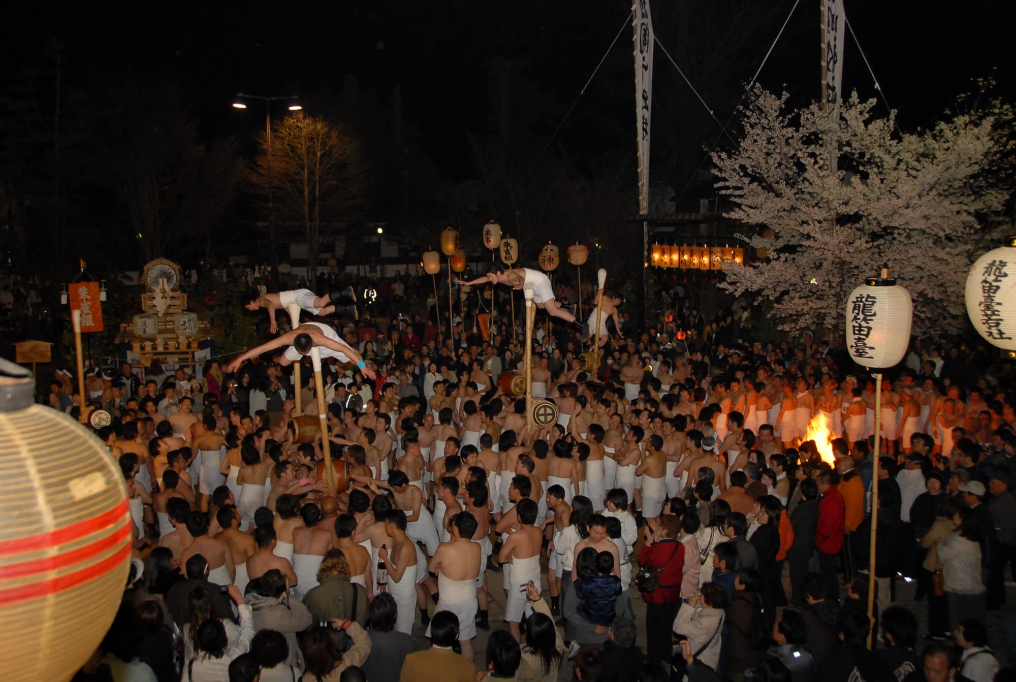 Furukawa festival is an annual celebration of the Keta Wakamiya Shrine held on April 19 and 20 every year. It is a historical festival designated as a national important intangible cultural heritage. Many tourists visit here to experience the air of excitement and impressiveness of "Okoshidaiko" every year. In "Okoshidaiko" performed on the night of the 19th, two young men move around the city riding back to back on a big drum and beat the big drum alternately by swinging down the handcrafted sticks with a length of around 90 cm. It is a lively and peculiar festival where the battles with other young men's brigades, who shoulder the small drums, called Tsuke daiko, go on until the late hours.